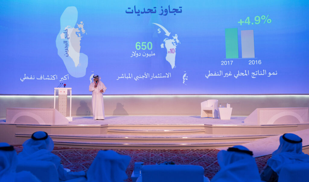 وأكد سموه على الاستمرار على تنفيذ رؤية البحرين الاقتصادية 2030 التي تم إطلاقها عام 2008 والالتزام التام بمبادئها الثلاثة القائمة على الاستدامة والتنافسية والعدالة، وقال سموه إنه منذ إطلاق هذه الرؤية فقد واجهنا العديد من التحديات، فجميعنا يستذكر ما واجهناه من تحديات في عام 2009 خلال الأزمة المالية العالمية، والأوضاع التي مرت بها المنطقة في عام 2011، ومع انخفاض أسعار النفط في الأسواق العالمية في عام 2014، إلا أننا في المملكة نجحنا في تجاوز التحديات، واستطعنا أن نحقق نموا اقتصاديا في القطاعات غير النفطية حيث بلغت نسبة النمو ما يقارب 5% في 2017، أما على صعيد الاستثمارات الأجنبية المباشرة فقد زاد حجمها عشرة أضعاف خلال الفترة من 2015 – 2018، مشيرا سموه إلى أن الاستثمارات سوف ترتفع إلى أكثر من 650 مليون دولار خلال العام الجاري 2018.