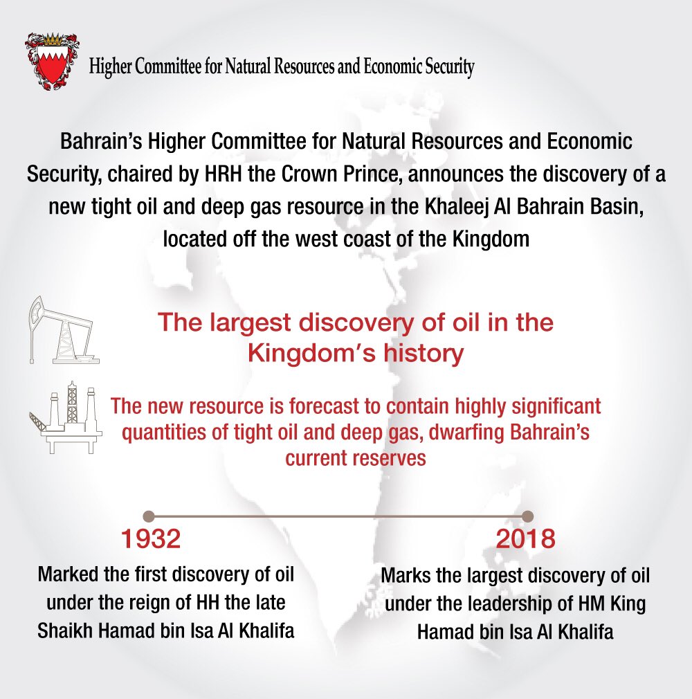 وقد أسفرت أعمال اللجنة بتوفيق من الله في التوصل الى أكبر اكتشاف في تاريخ مملكة البحرين، وبهذه المناسبة يرفع صاحب السمو الملكي ولي العهد نائب القائد الأعلى النائب الأول لرئيس مجلس الوزراء وأعضاء اللجنة أسمى آيات التبريكات الى المقام السامي لحضرة صاحب الجلالة الملك المفدى وإلى صاحب السمو الملكي رئيس مجلس الوزراء، وتعلن اللجنة العليا للثروات الطبيعية والأمن الاقتصادي عن اكتشاف مورد كبير من النفط الصخري الخفيف تقدر كمياته بأضعاف حقل البحرين، بالإضافة إلى اكتشاف كميات كبيرة من الغاز العميق.