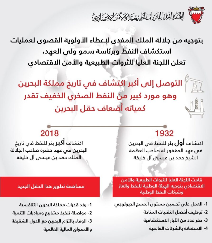 ويعتبر هذا الاكتشاف خلال العهد الزاهر لحضرة صاحب الجلالة الملك حمد بن عيسى آل خليفة عاهل البلاد المفدى حفظه الله ورعاه أول اكتشاف منذ عام 1932 عندما تم تدشين أول بئر للنفط في المملكة خلال عهد المغفور له صاحب العظمة الشيخ حمد بن عيسى آل خليفة ليسجل بذلك امتداداً لمسيرة الخير والبناء التي تميزت بتوظيف موارد النفط لصالح التنمية والتطوير بمملكة البحرين.
