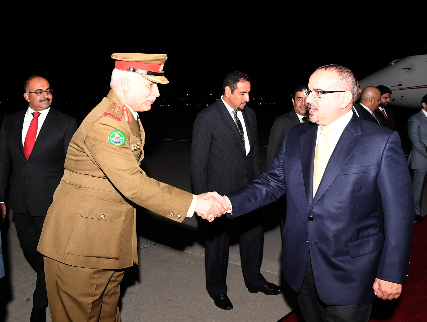 كما يرافق سموه وفدٌ عسكري وأمني يضم كلاً من اللواء طارق بن حسن الحسن رئيس الأمن العام واللواء ركن منير بن أحمد السبيعي مدير مكتب نائب القائد الأعلى والعميد ركن طيار الشيخ محمد بن سلمان آل خليفة رئيس شعبة العمليات في سلاح الجو الملكي البحريني.