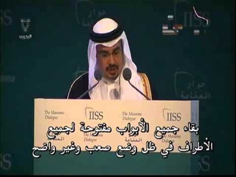 بسم الله الرحمن الرحيم مساء الخير سيداتي سادتي، انه لسرور كبير أن نراكم هنا جميعاً و أود أن أعرب عن خالص شكري لوقتكم و طاقتكم و جهدكم للتواجد هنا في ظروف تتطلب منا التفكر و التأمل ملياً و الوعي لدى التعامل مع الشؤون الواردة في المشهد. و أود أن أشكرك، سيدي، و المعهد الدولي للدراسات الاستراتيجية للعمل الرائع الذي قمتم به حول العالم، و ما قمتم به من مجهود متميز في اجتماعات الشيربا في العام الماضي، و خاصة لاستئناف اقامة حوار المنامة في هذا الوقت الحساس. أعتقد أنني سأبدأ بتناول بعض التحديات الإقليمية و المواضيع الهامة التي تعنى بها الكثير من الحكومات حول العالم: و قد يكون منع الانتشار النووي من أولى الشؤون التي ترد في أذهانكم؛ و بروز المتطرفين مقترناً باحتمال- لا قدر الله- استخدام الأسلحة الكيميائية و البيولوجية من قبل دول معرضة للانهيار في الوقت الحاضر و امكانية الإرهاب الناتج عن هذه الخطوة المريعة- مما يستدعي اهتماماً جاداً؛ و ثالثاً: أمن النفط، و هو شأن قلما يتطرق الحديث اليه و لكنه ما زال محورياً لتعافي العديد من الاقتصادات حول العالم، خاصة في الولايات المتحدة و لعلها إلى حد أكبر في أوروبا؛ رابعاً: تعزيز الديقراطية و سيادة القانون كهدف راسخ للعديد من الحكومات، و خاصة في الغرب، و لا أرى ذلك قابلاً للتغيير في المدى القريب؛ و بالنسبة للولايات المتحدة نخص بالذكر إدارتها لعلاقتها مع دولة اسرائيل و عملية السلام المتعثرة، مما يهمنا جميعاً. كانت تلك خمس مواضع اهتمام أمنية ذات وزن ثقيل، أنا متأكد أن العديد منكم يدركها.