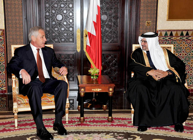 ورحب سموه بمشاركة السيد Chuck Hagel وزير الدفاع الامريكي في أعمال حوار المنامة وذلك خلال لقاء سموه به اليوم . هذا و بحث صاحب السمو الملكي ولي العهد نائب القائد الأعلى النائب الأول لرئيس مجلس الوزراء حفظه الله ، مع السيد Chuck Hagel محاور مؤتمر المنامة ، والتطورات على الساحتين الإقليمية والدولية ، وقضايا الأمن والاستقرار والسلام في المنطقة .