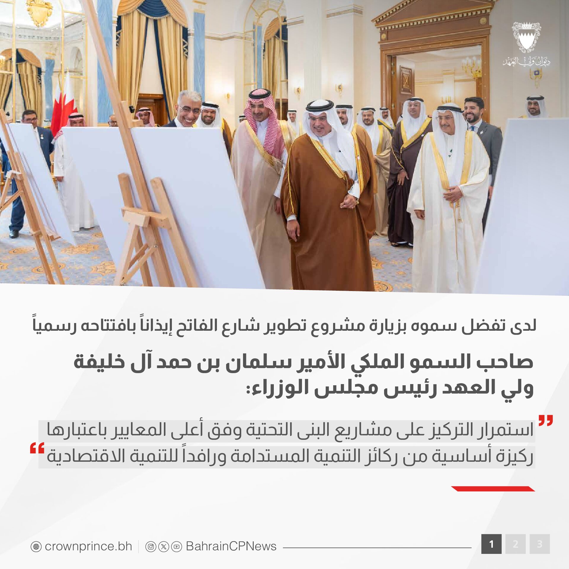 جاء ذلك لدى تفضل سموه بزيارة مشروع تطوير شارع الفاتح إيذاناً بافتتاحه رسمياً، والذي يُعد أحد مشاريع البنية التحتية الهامة لما له من دور في زيادة انسيابية الحركة والتنقل بين عدد من المشاريع السياحية والاقتصادية والاستثمارية بمحافظة العاصمة والتي تخدم أبناء البحرين والمقيمين وكافة زوار المملكة.