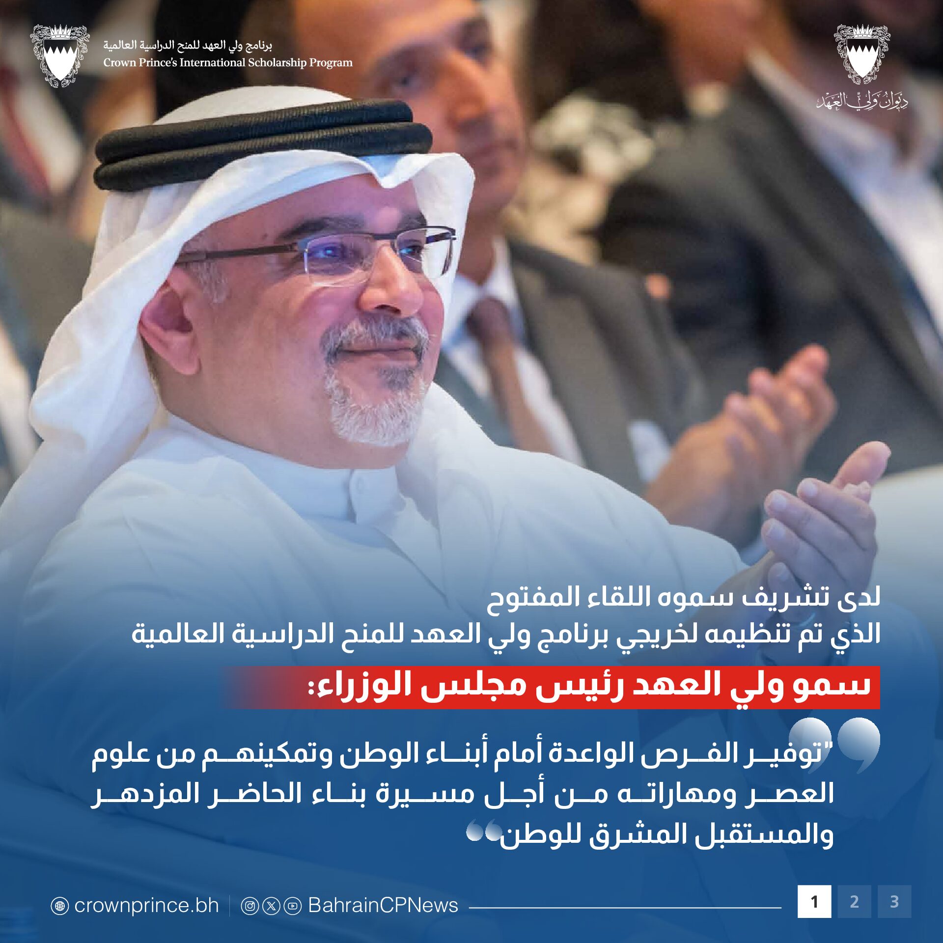 جاء ذلك لدى تشريف سموه حفظه الله اليوم اللقاء المفتوح الذي تم تنظيمه لخريجي برنامج ولي العهد للمنح الدراسية العالمية منذ انطلاقته عام 1999، وذلك بمناسبة الاحتفال باليوبيل الفضي لانطلاق البرنامج، بحضور معالي الشيخ سلمان بن خليفة آل خليفة وزير المالية والاقتصاد الوطني، وعدد من أصحاب المعالي والسعادة من كبار المسؤولين، حيث رحب سموه بالجميع، وقال سموه إننا إذ نحتفل اليوم بمرور 25 عاماً على انطلاق برنامج ولي العهد للمنح الدراسية العالمية، فإننا نعتز ونفتخر بالنجاحات التي حققها خريجو البرنامج من خلال عملهم في القطاعين العام والخاص.