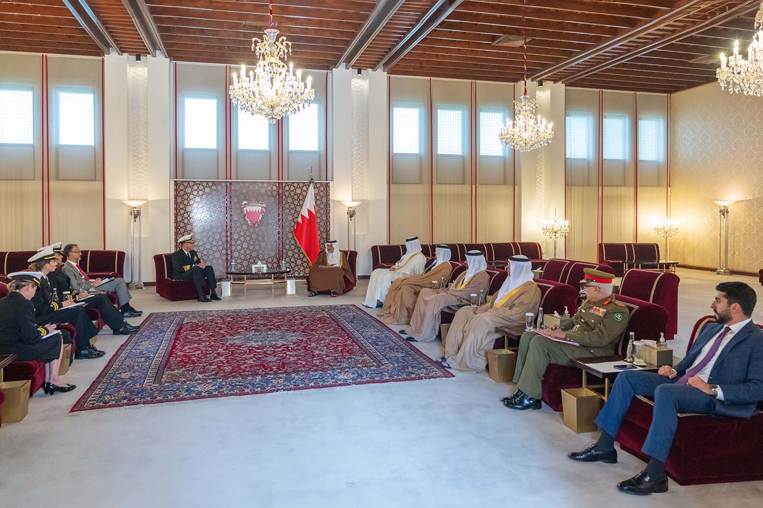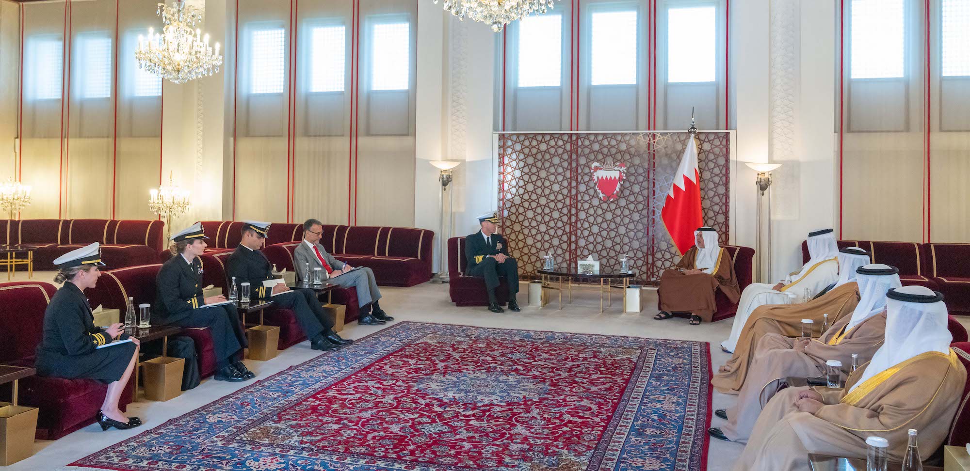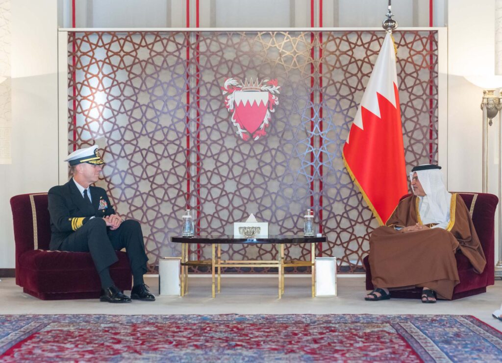 جاء ذلك لدى لقاء سموه حفظه الله بقصر الرفاع اليوم، بحضور سمو الشيخ عيسى بن سلمان بن حمد آل خليفة رئيس مجلس أمناء وقف عيسى بن سلمان التعليمي الخيري رئيس مجلس إدارة صندوق العمل، وسمو الشيخ محمد بن سلمان بن حمد آل خليفة، ومعالي الشيخ سلمان بن خليفة آل خليفة وزير المالية والاقتصاد الوطني، الفريق بحري جورج وايكوف قائد القوات البحرية بالقيادة المركزية الأمريكية قائد الأسطول الخامس، وذلك بمناسبة تعيينه، حيث رحب سموه بالفريق بحري جورج وايكوف متمنياً له التوفيق والسداد في مهام عمله الجديدة، مشيراً سموه إلى الدور المحوري للولايات المتحدة الأمريكية إلى جانب الدول الشقيقة والصديقة في ترسيخ ركائز السلم والأمن الدوليين.