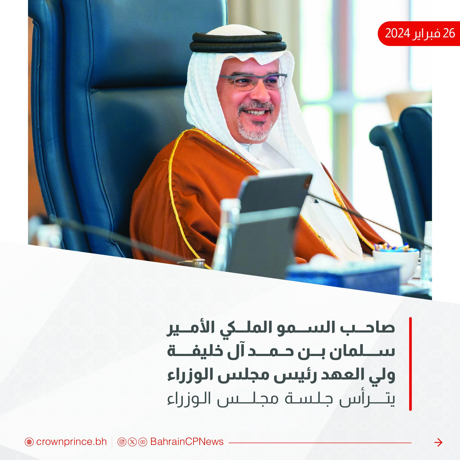 ترأس صاحب السمو الملكي الأمير سلمان بن حمد آل خليفة ولي العهد رئيس مجلس الوزراء، الاجتماع الاعتيادي الأسبوعي لمجلس الوزراء الذي عقد اليوم، بقصر القضيبية.