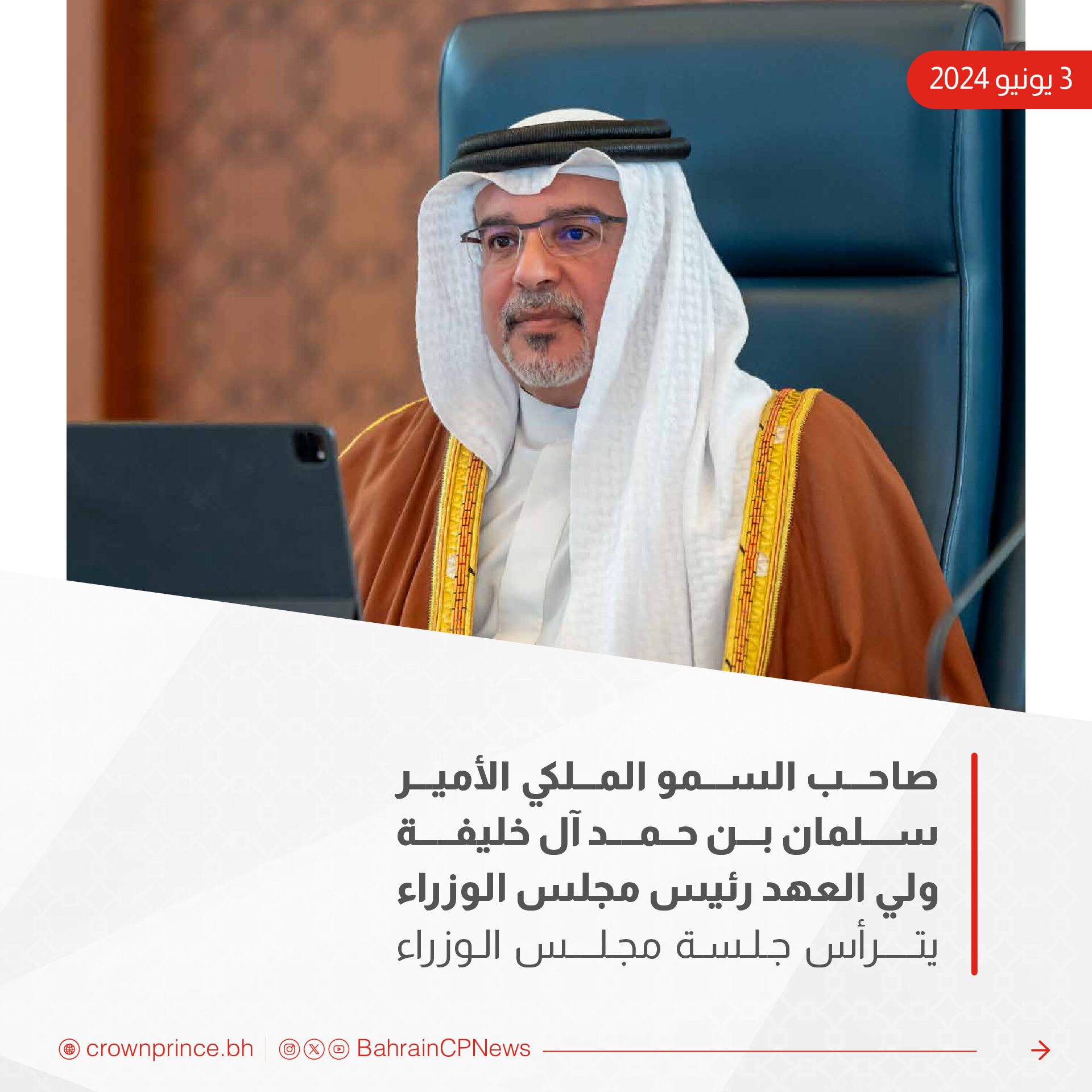 ترأس صاحب السمو الملكي الأمير سلمان بن حمد آل خليفة ولي العهد رئيس مجلس الوزراء، الاجتماع الاعتيادي الأسبوعي لمجلس الوزراء الذي عُقد اليوم، بقصر القضيبية.