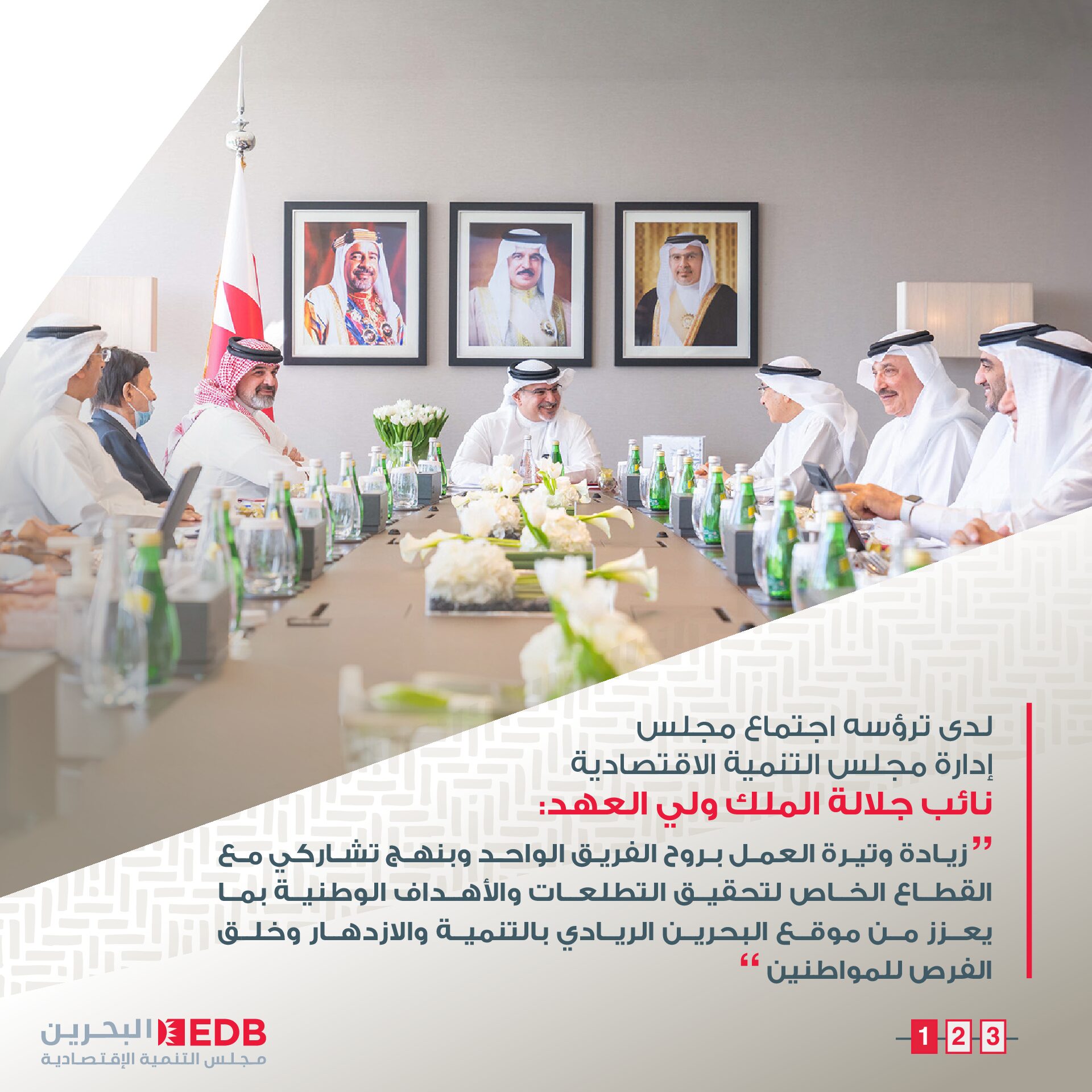 جاء ذلك لدى ترؤس سموه حفظه الله اجتماع مجلس التنمية الاقتصادية الذي عقد صباح اليوم في مقر المجلس بخليج البحرين، بحضور سمو الشيخ عبدالله بن حمد آل خليفة الممثل الشخصي لجلالة الملك المعظم، ومعالي الشيخ خالد بن عبدالله آل خليفة نائب رئيس مجلس الوزراء، وعدد من أصحاب السعادة من كبار المسؤولين وأعضاء مجلس الإدارة لمجلس التنمية الاقتصادية، حيث تم استعراض جهود المجلس المبذولة في استقطاب الاستثمارات المباشرة في القطاعات الحيوية ذات الأولوية، والمساهمة في تعزيز مكانة البحرين كوجهة عالمية جاذبة للاستثمار، وخلق الفرص النوعية لصالح المواطنين، ومناقشة أبرز المستجدات الاقتصادية الإقليمية والعالمية.