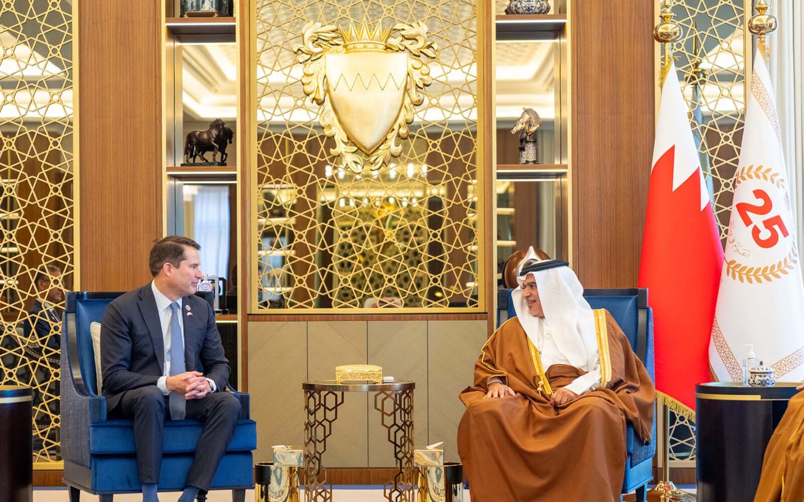 جاء ذلك لدى لقاء سموه حفظه الله اليوم في قصر القضيبية، بحضور سمو الشيخ محمد بن سلمان بن حمد آل خليفة، ومعالي الشيخ سلمان بن خليفة آل خليفة وزير المالية والاقتصاد الوطني، السيد سيث ويلبير مولتون عضو الكونغرس الأمريكي، ممثل ولاية ماساتشوستس بالولايات المتحدة الأمريكية، حيث أشار سموه إلى ما وصل إليه العمل والتنسيق المشترك بين مملكة البحرين والولايات المتحدة الأمريكية الصديقة من مستوياتٍ متقدمة، وأهمية الاستمرار في الدفع بالعلاقات الثنائية والشراكة الاستراتيجية نحو مزيدٍ من التكامل، بما يعود بالخير على الجميع.