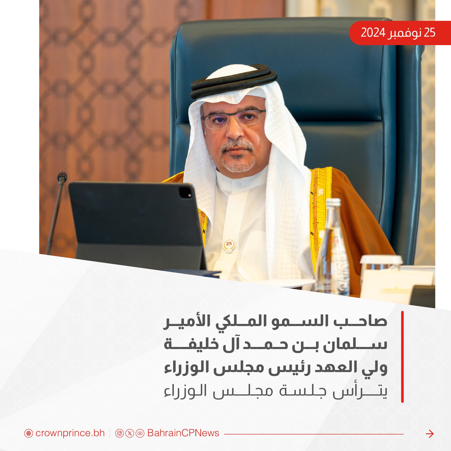 ترأس صاحب السمو الملكي الأمير سلمان بن حمد آل خليفة ولي العهد رئيس مجلس الوزراء ، الاجتماع الاعتيادي الأسبوعي لمجلس الوزراء الذي عقد اليوم، بقصر القضيبية.