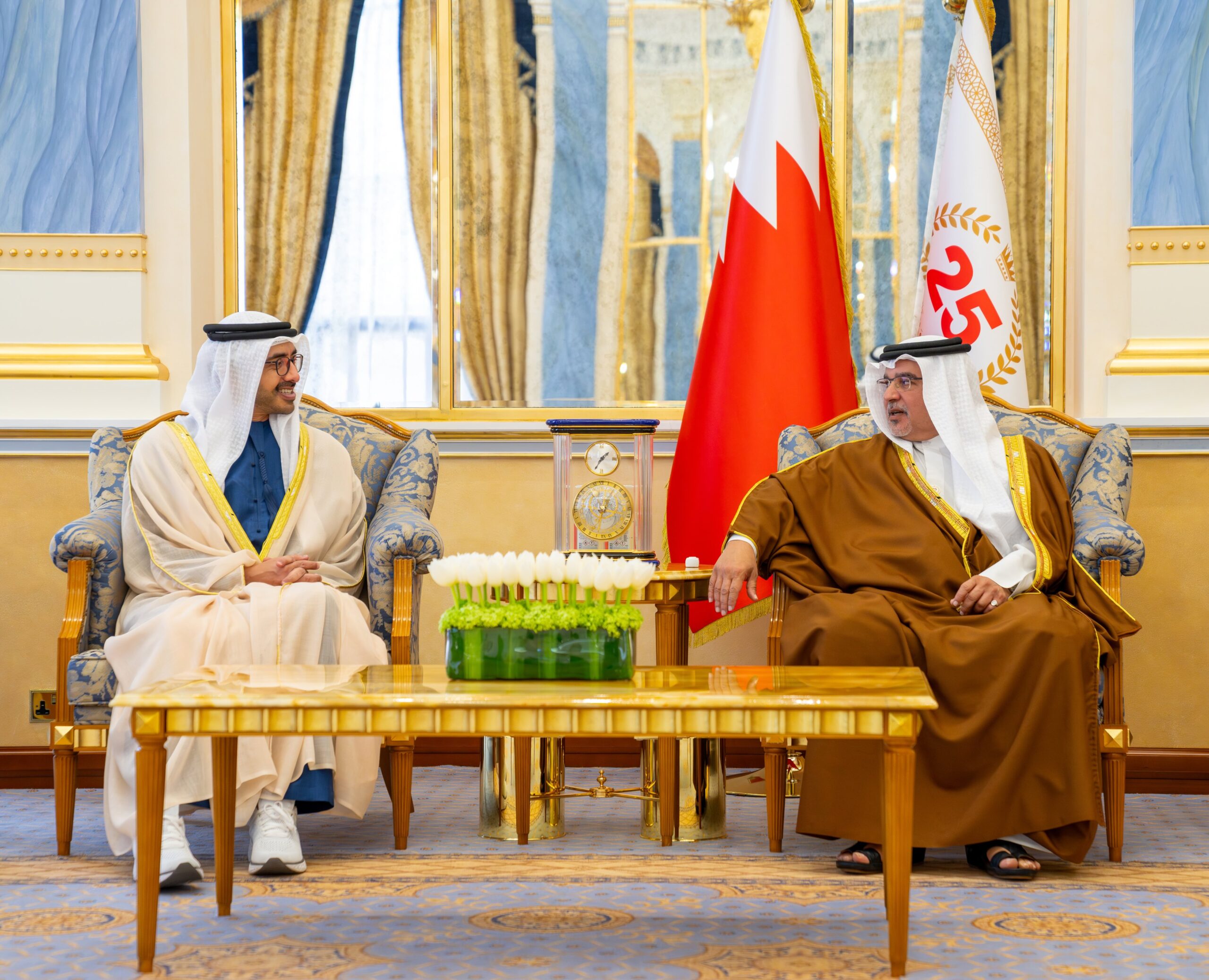 وقد نقل سمو الشيخ عبدالله بن زايد آل نهيان إلى صاحب السمو الملكي ولي العهد رئيس مجلس الوزراء تحيات وتقدير صاحب السمو الشيخ محمد بن زايد آل نهيان رئيس دولة الإمارات العربية المتحدة الشقيقة، وصاحب السمو الشيخ محمد بن راشد آل مكتوم نائب رئيس الدولة رئيس مجلس الوزراء حاكم دبي، وأصدق تمنياتهما لمملكة البحرين وشعبها بدوام التقدم والنماء، فيما حمّله صاحب السمو الملكي ولي العهد رئيس مجلس الوزراء بنقل خالص تحيات سموه إلى أخيه صاحب السمو رئيس دولة الإمارات العربية المتحدة، وأخيه صاحب السمو نائب رئيس الدولة رئيس مجلس الوزراء حاكم دبي، وتمنياته لشعب دولة الإمارات الشقيق بالمزيد من التقدم والازدهار.