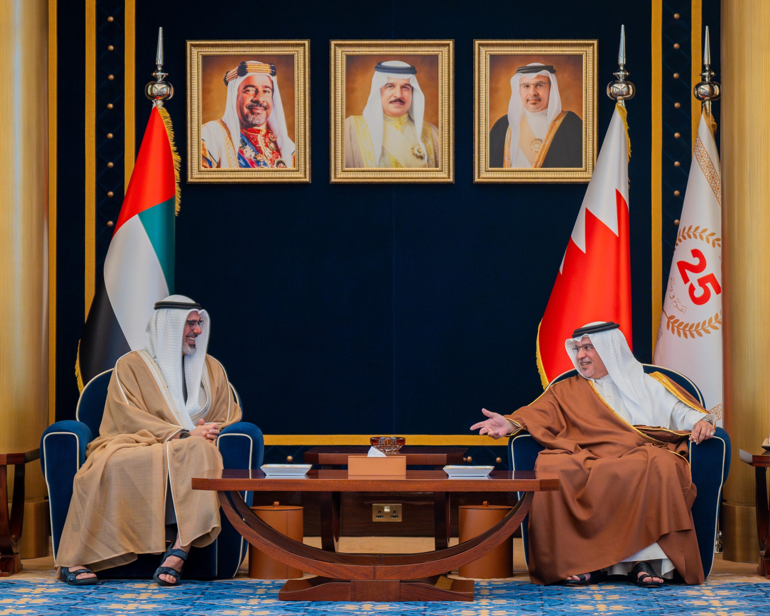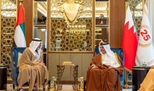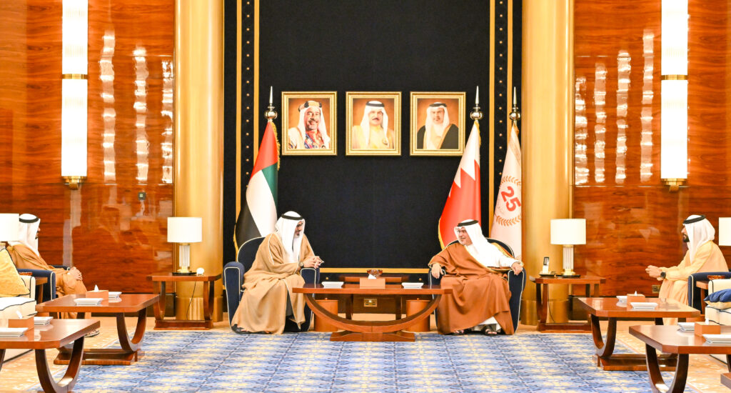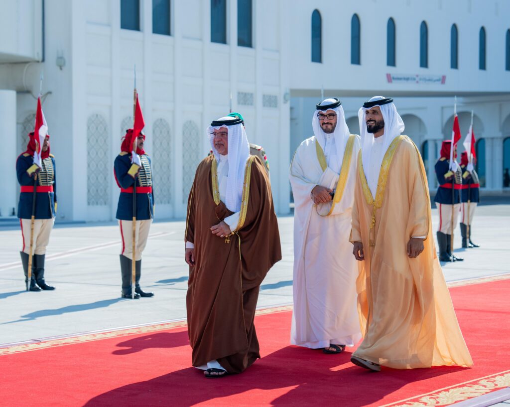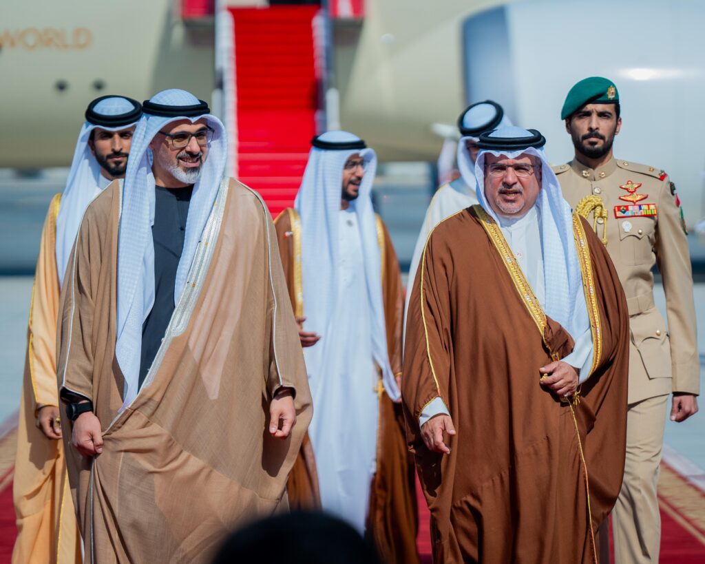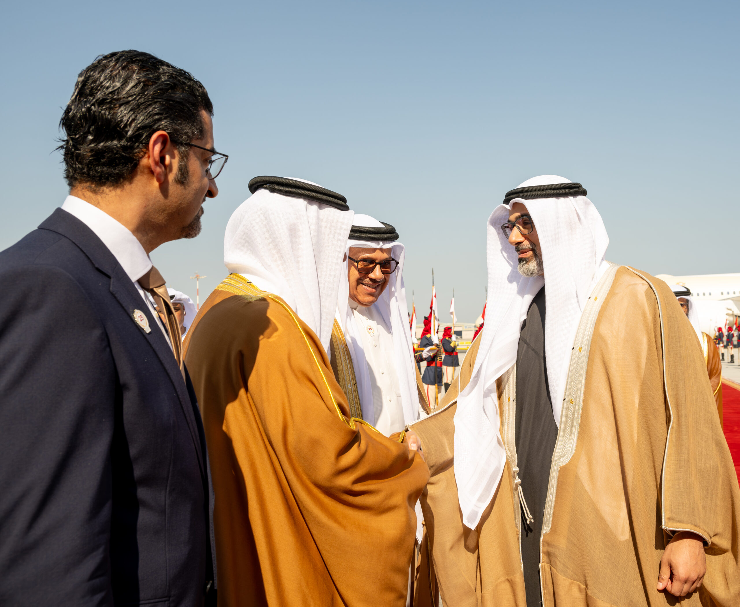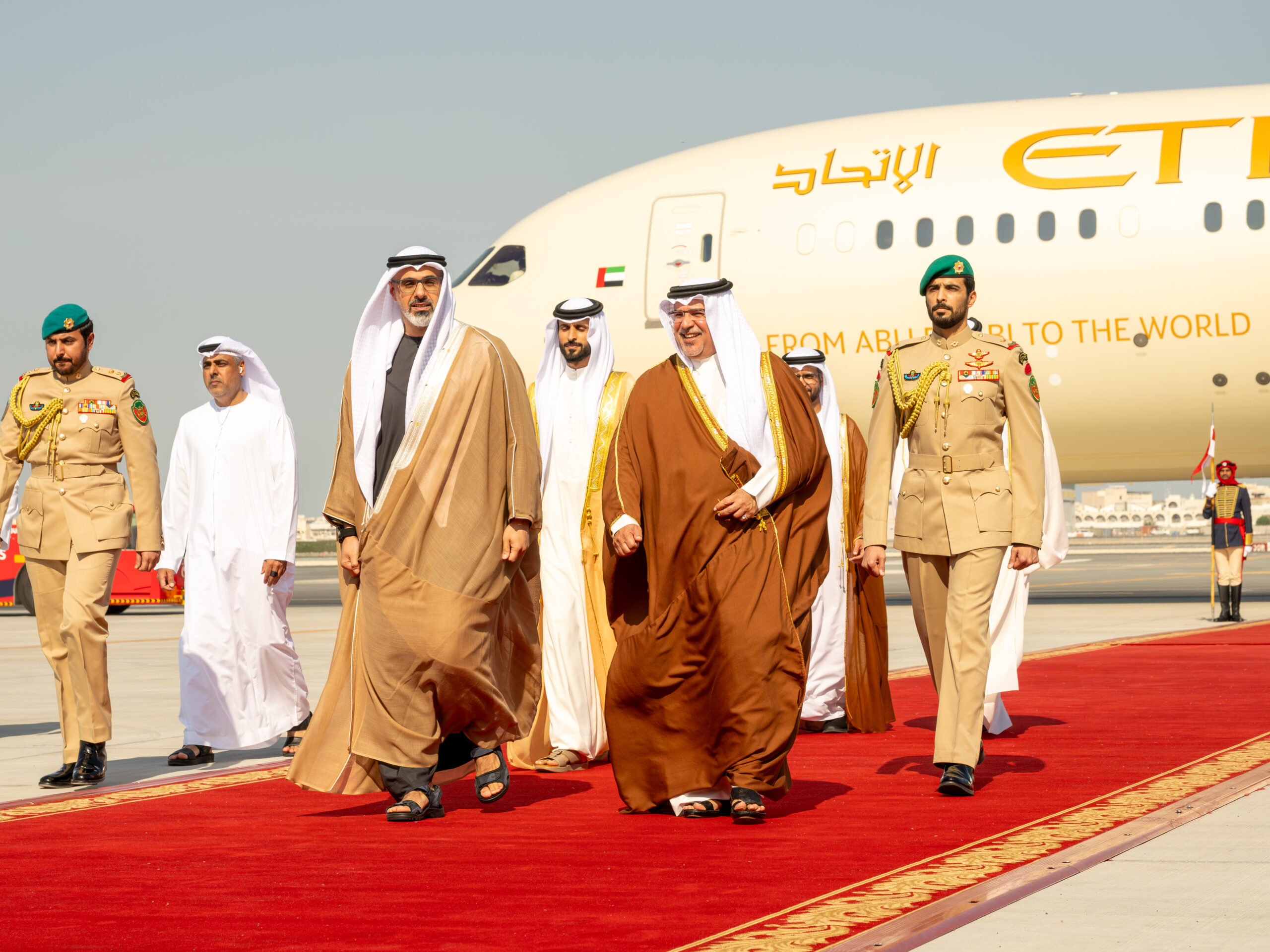 كان صاحب السمو الملكي الأمير سلمان بن حمد آل خليفة ولي العهد رئيس مجلس الوزراء في مقدمة مستقبلي أخيه سمو الشيخ خالد بن محمد بن زايد آل نهيان ولي عهد أبوظبي بدولة الإمارات العربية المتحدة الشقيقة لدى وصوله إلى البلاد في زيارة رسمية يقوم بها إلى مملكة البحرين، يجري سموه خلالها مباحثات مع صاحب السمو الملكي ولي العهد رئيس مجلس الوزراء تتناول العلاقات الأخوية التاريخية وجوانب التعاون والعمل المشترك بين البلدين، خاصة في المجالات الاقتصادية والاستثمارية والتنموية وغيرها من المجالات الحيوية التي تعزز رؤيتهما تجاه تحقيق التنمية والازدهار للشعبين الشقيقين والسلام والاستقرار في المنطقة، حيث رحب سموه بزيارة أخيه سمو الشيخ خالد بن محمد بن زايد آل نهيان، والتي تعكس ما يجمع البلدين الشقيقين من علاقات أخوية متينة وروابط وثيقة ممتدة عبر تاريخ من العمل والتنسيق المشترك في كافة المجالات، متمنيًا لسموه طيب الإقامة في مملكة البحرين.