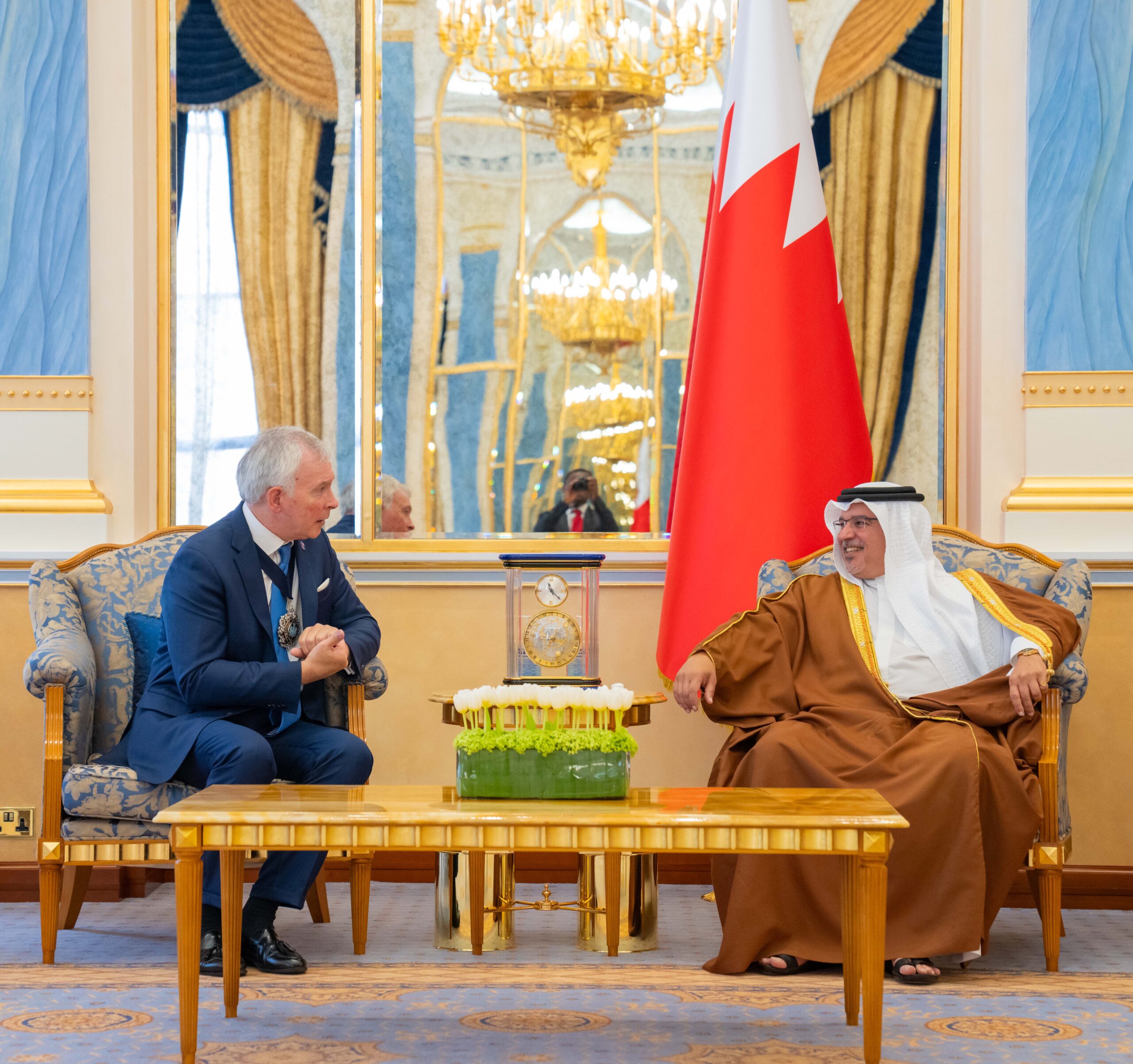 جاء ذلك لدى لقاء سموه حفظه الله بقصر القضيبية اليوم، اللورد نيكولاس ليونز عمدة الحي المالي لمدينة لندن، بحضور سمو الشيخ عيسى بن سلمان بن حمد آل خليفة رئيس مجلس أمناء وقف عيسى بن سلمان التعليمي الخيري، وسمو الشيخ محمد بن سلمان بن حمد آل خليفة، ومعالي الشيخ سلمان بن خليفة آل خليفة وزير المالية والاقتصاد الوطني، وعددٍ من أصحاب السعادة من كبار المسؤولين، حيث رحب سموه بزيارة اللورد نيكولاس ليونز والوفد المرافق والتي تأتي في إطار الحرص المتبادل على تقوية الشراكات القائمة بين مملكة البحرين والمملكة المتحدة وبما يسهم في فتح مسارات أرحب في القطاعات ذات الأولوية للتعاون الثنائي وفي مقدمتها ما يتصل بالمجالات الاقتصادية والاستثمارية والمالية.