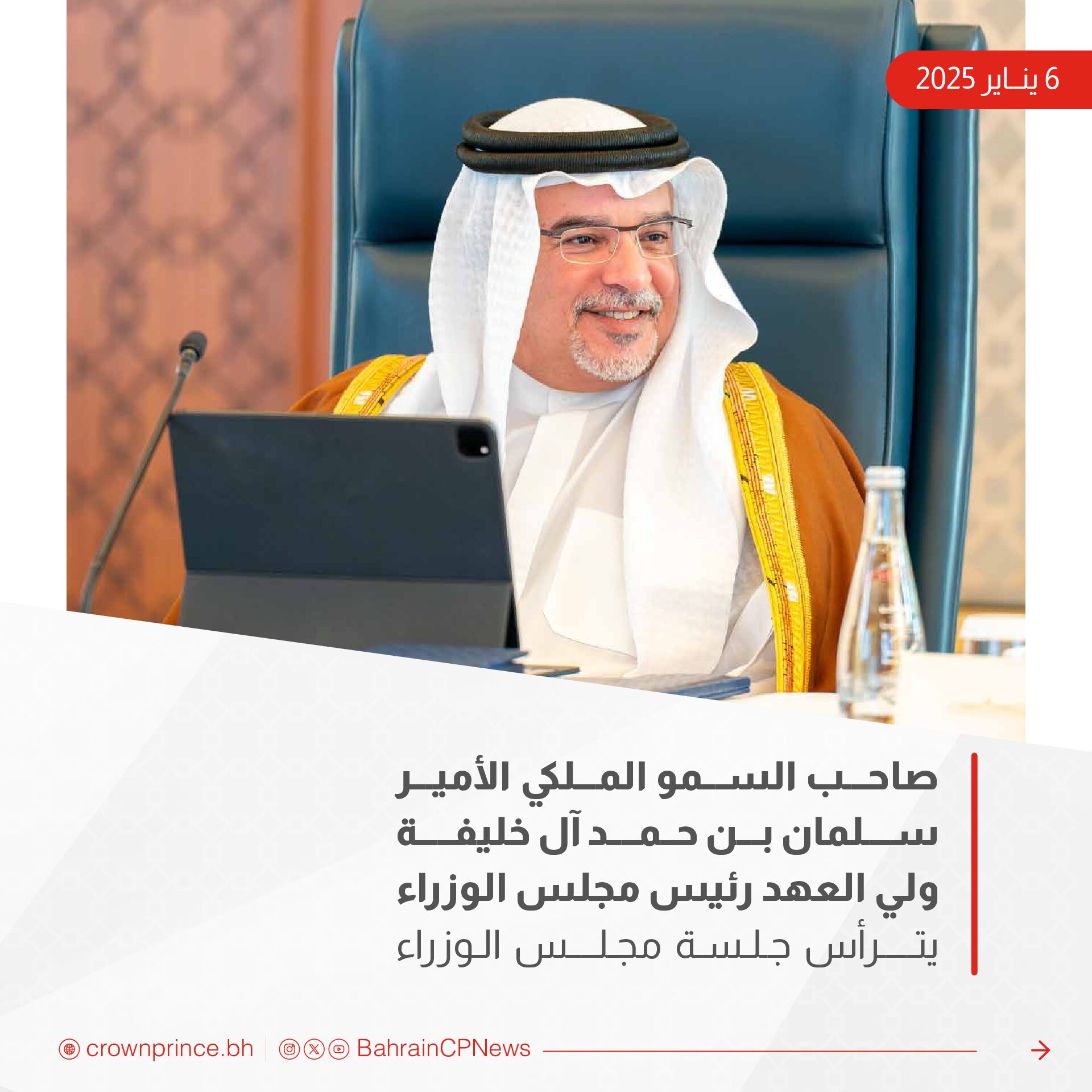 ترأس صاحب السمو الملكي الأمير سلمان بن حمد آل خليفة، ولي العهد رئيس مجلس الوزراء، حفظه الله، الاجتماع الاعتيادي الأسبوعي لمجلس الوزراء الذي عُقد اليوم في قصر القضيبية.