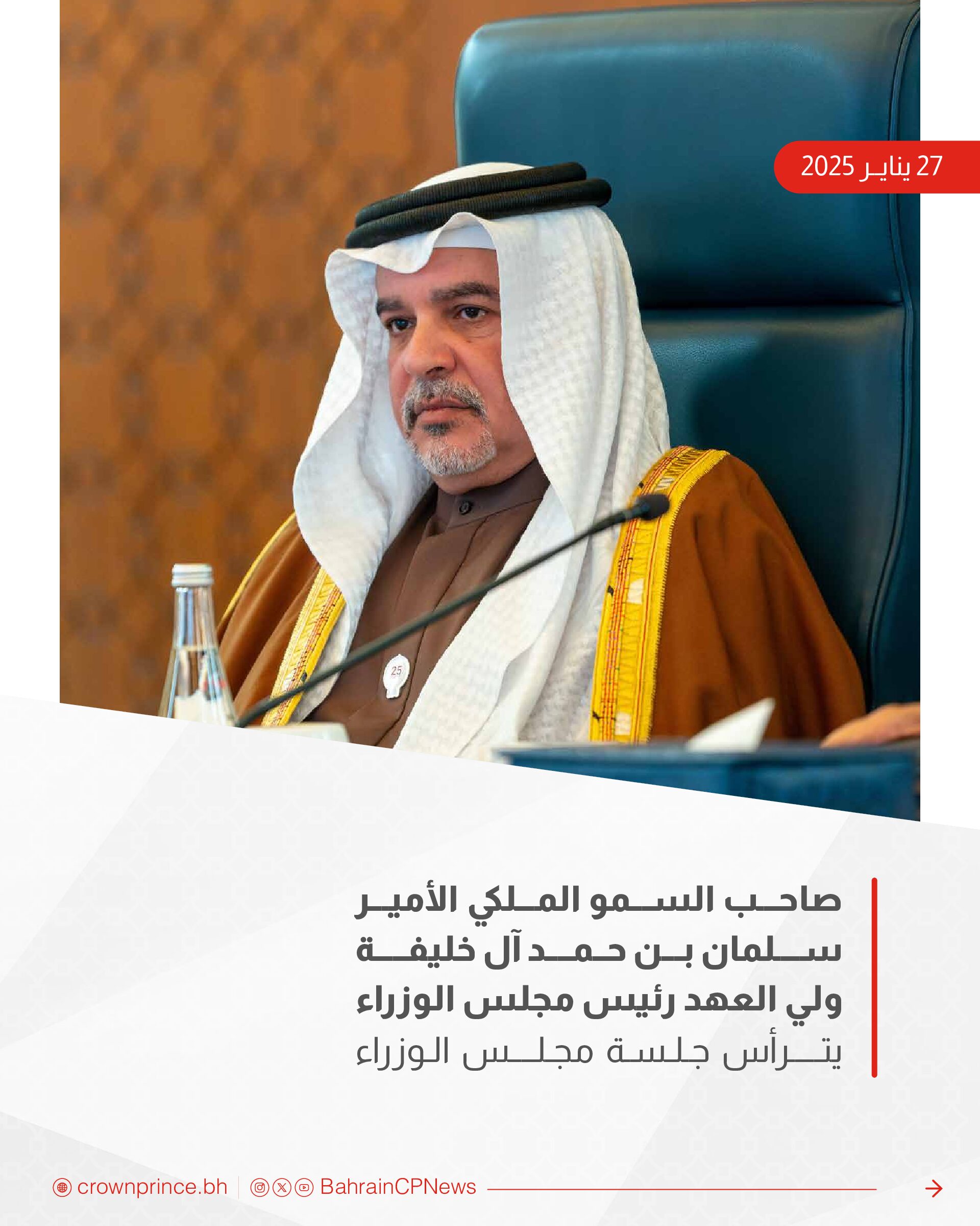ترأس صاحب السمو الملكي الأمير سلمان بن حمد آل خليفة، ولي العهد رئيس مجلس الوزراء، حفظه الله، الاجتماع الاعتيادي الأسبوعي لمجلس الوزراء الذي عُقد اليوم في قصر القضيبية.