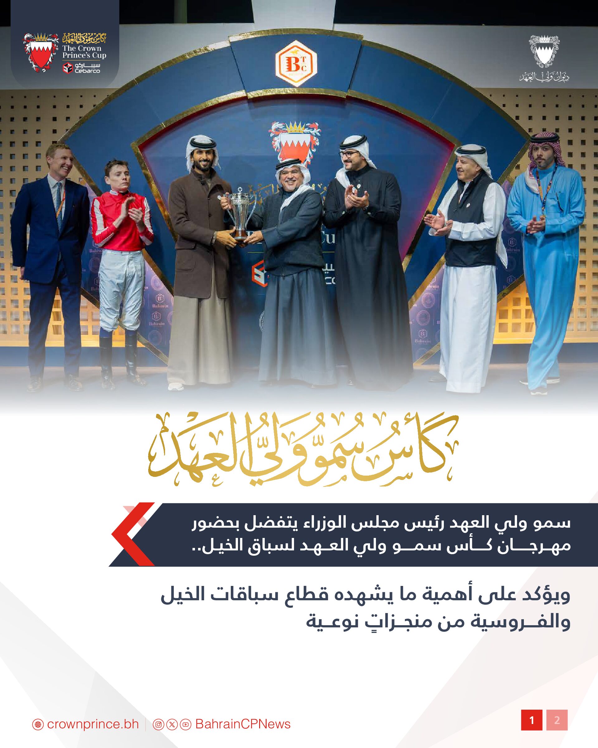 ولفت سموه إلى حسن الإعداد والمستوى التنظيمي العالي الذي حظي به مهرجان كأس سمو ولي العهد لسباق الخيل، وما شهدته أشواط السباق من منافسات قوية وأجواء حماسية، معربًا عن شكره وتقديره لجهود كافة القائمين والمنظمين، وتمنياته بدوام التوفيق والنجاح للملاك والمدربين والفرسان من مختلف الإسطبلات من داخل مملكة البحرين وخارجها.