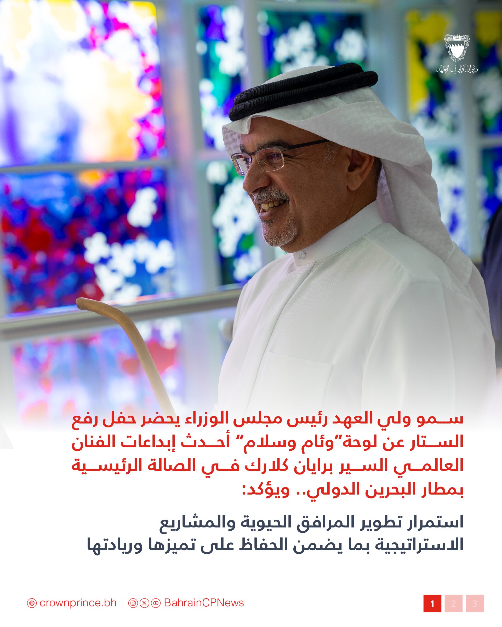 جاء ذلك لدى تفضل سموه حفظه الله اليوم ، بحضور سمو الشيخ عيسى بن سلمان بن حمد آل خليفة رئيس مجلس أمناء وقف عيسى بن سلمان التعليمي الخيري رئيس مجلس إدارة صندوق العمل، وعدد من أصحاب السمو والمعالي والسعادة من كبار المسؤولين، بحضور حفل رفع الستار عن لوحة“وئام وسلام” (Concordia)، أحدث إبداعات الفنان العالمي السير برايان كلارك في الصالة الرئيسية بمطار البحرين الدولي، حيث أوضح سموه أن هذه المبادرة تسهم في إضفاء بعد جمالي متميز على أحد أهم المرافق الحيوية في مملكة البحرين، مؤكداً أن تعزيز حضور الفن والثقافة في الفضاءات العامة يشكل جزءًا أصيلاً من تجربة المسافرين.