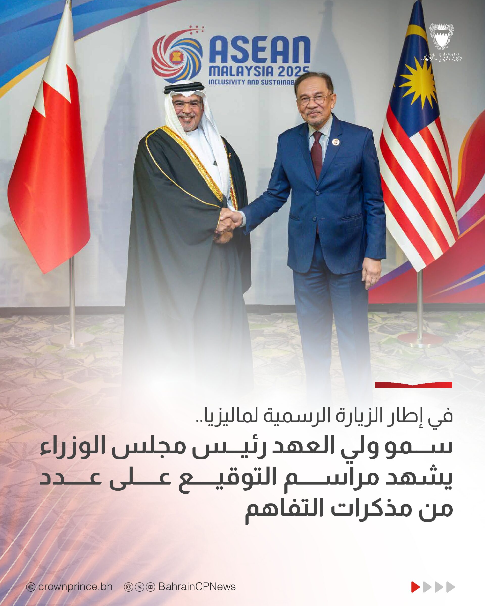 سمو ولي العهد رئيس مجلس الوزراء يلتقي معالي السيد أنور إبراهيم رئيس وزراء ماليزيا ويشهد مراسم التوقيع على عدد من مذكرات التفاهم بين حكومة مملكة البحرين وحكومة ماليزيا