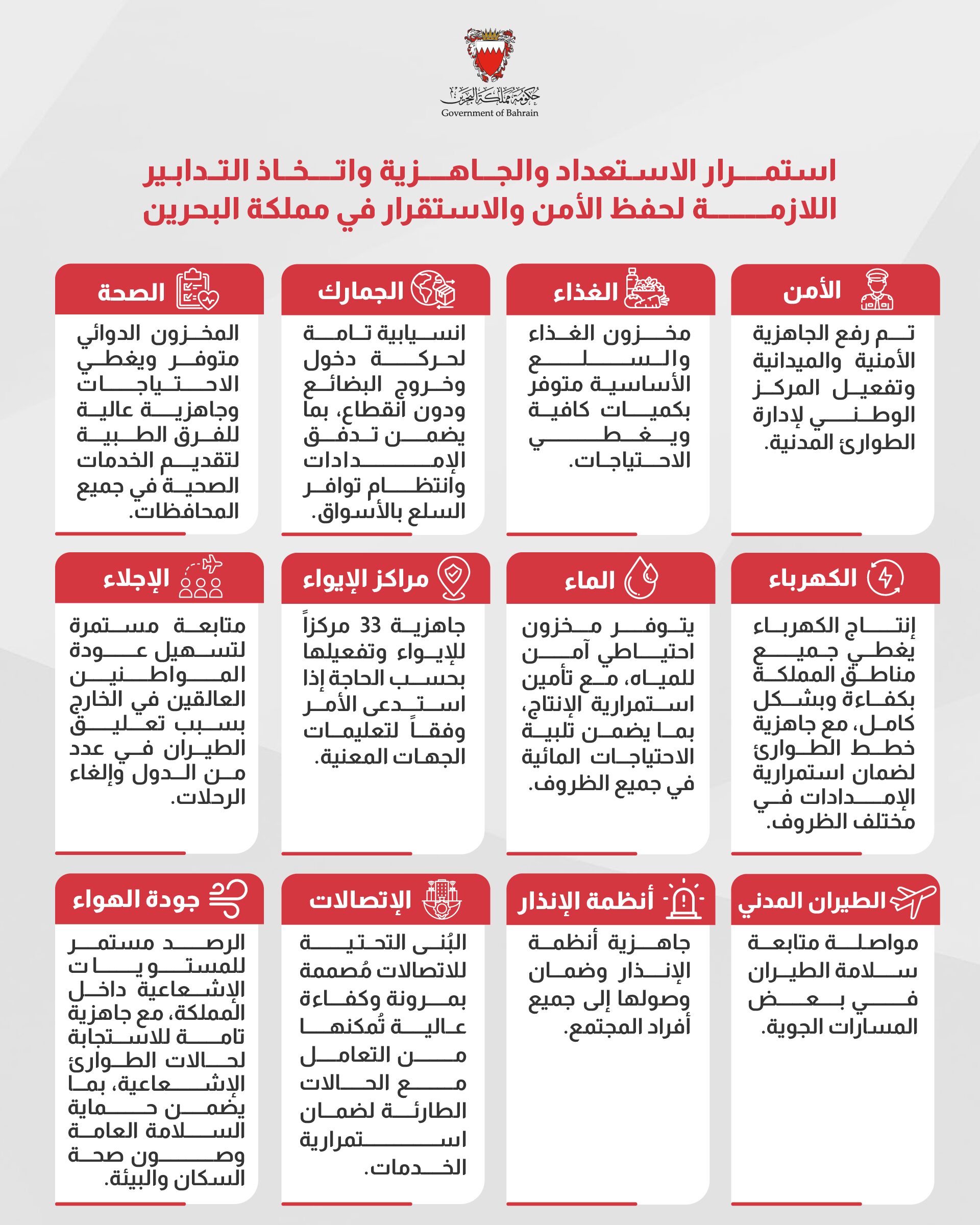 وفي سياق ذي صلة، تابع المجلس مستجدات الأوضاع الإقليمية وتداعياتها على الأمن والاستقرار في المنطقة، واطلع المجلس على شرح مفصل من معالي وزير الداخلية رئيس مجلس الدفاع المدني حول الاستعدادات التي تم اتخاذها لرفع الجاهزية لإدارة الطوارئ المدنية في ظل تطورات الأوضاع الإقليمية، وفي هذا الصدد وجه المجلس إلى مواصلة اتخاذ التدابير اللازمة للتعامل مع الحالات الطارئة وفق الظروف الراهنة بالمنطقة كما تم التأكيد على ما يلي: