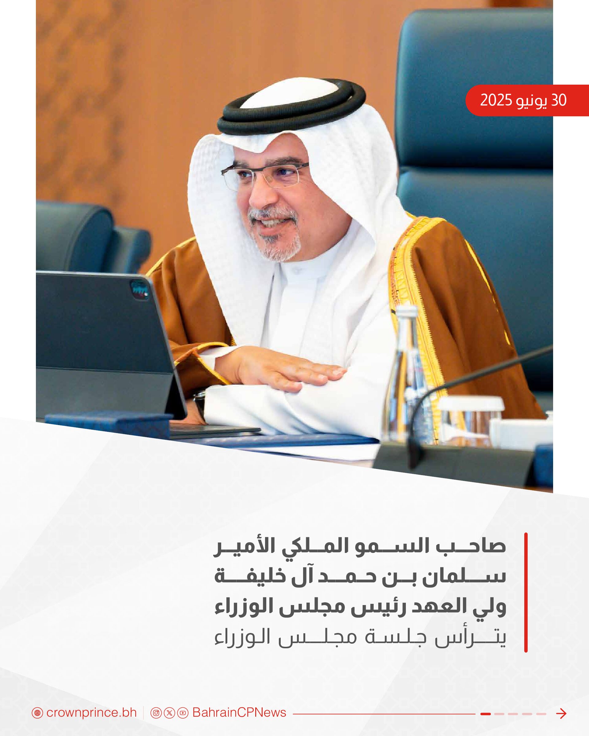 ترأس صاحب السمو الملكي الأمير سلمان بن حمد آل خليفة ولي العهد رئيس مجلس الوزراء حفظه الله، الاجتماع الاعتيادي الأسبوعي لمجلس الوزراء الذي عقد اليوم، بقصر القضيبية.