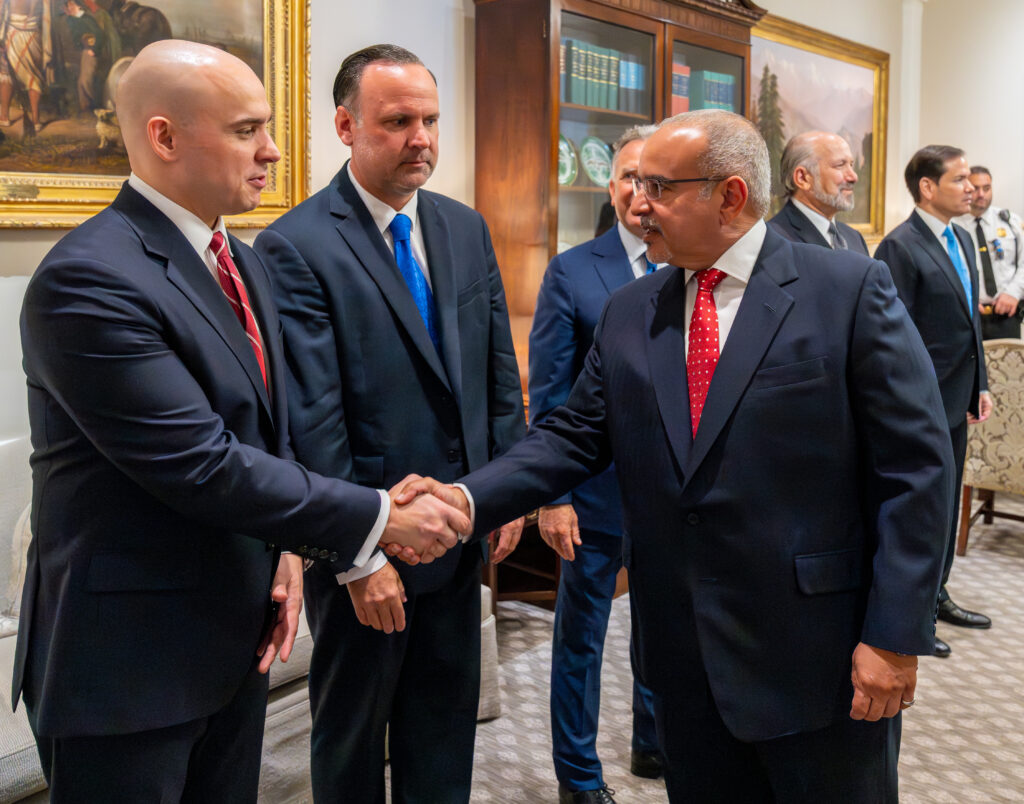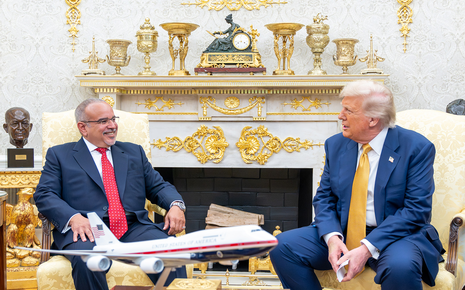 من جانبه قال فخامة الرئيس دونالد ترامب، رئيس الولايات المتحدة الأمريكية الصديقة، بأن حضرة صاحب الجلالة الملك حمد بن عيسى آل خليفة ملك البلاد المعظم حفظه الله ورعاه، شخصية تحظى بالاحترام الكبير في منطقة الشرق الأوسط وفي العالم أجمع، مرحبًا بصاحب السمو الملكي الأمير سلمان بن حمد آل خليفة ولي العهد رئيس مجلس الوزراء حفظه الله، وأعرب عن سعادته باستضافة سموه في البيت الأبيض، كما أعرب عن ترحيبه بسمو الشيخ عيسى بن سلمان بن حمد آل خليفة وزير ديوان رئيس مجلس الوزراء.