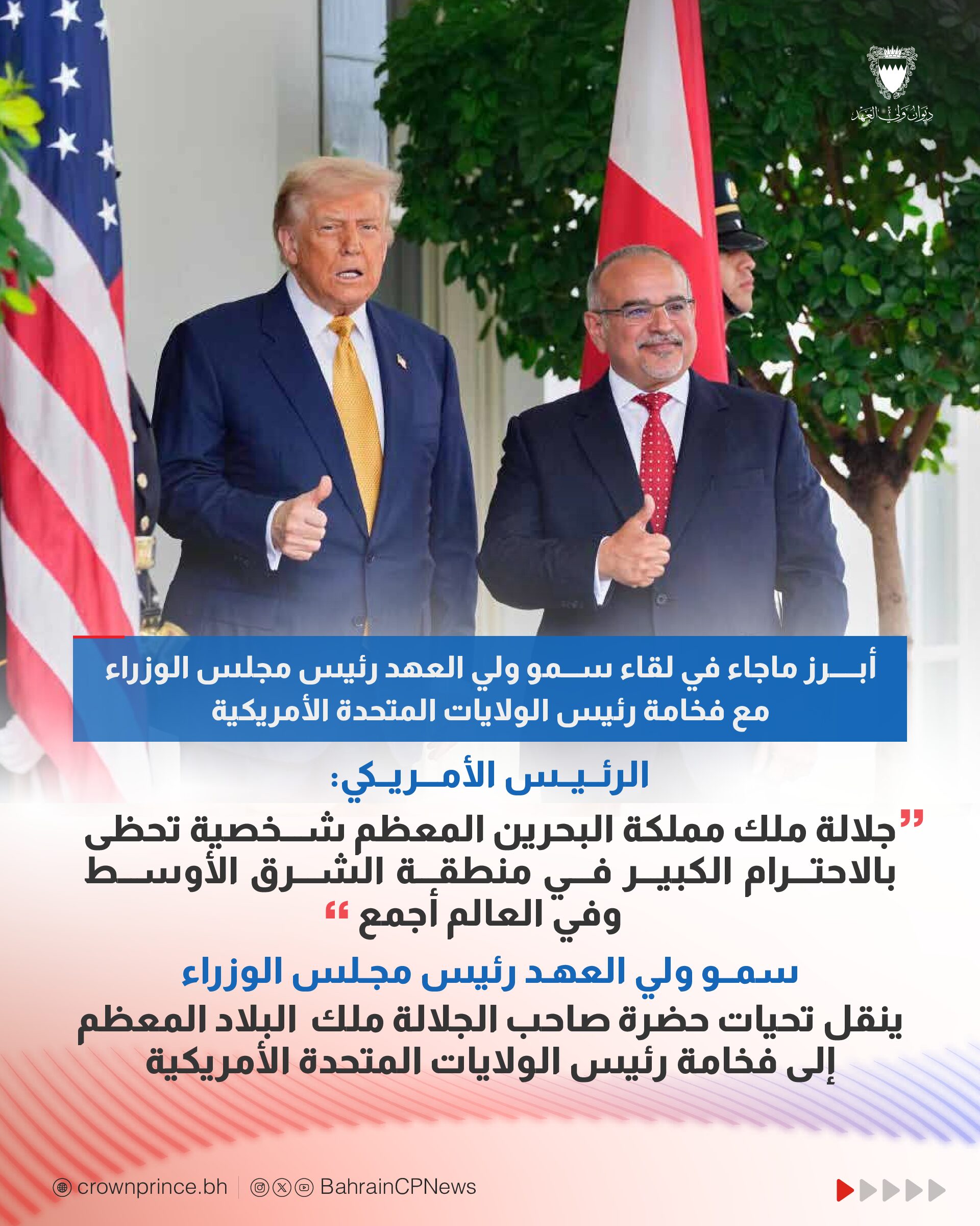 لدى لقائه بصاحب السمو الملكي ولي العهد رئيس مجلس الوزراء… الرئيس الأمريكي ترامب: حضرة صاحب الجلالة الملك حمد بن عيسى آل خليفة شخصية تحظى بالاحترام الكبير في منطقة الشرق الأوسط وفي العالم أجمع