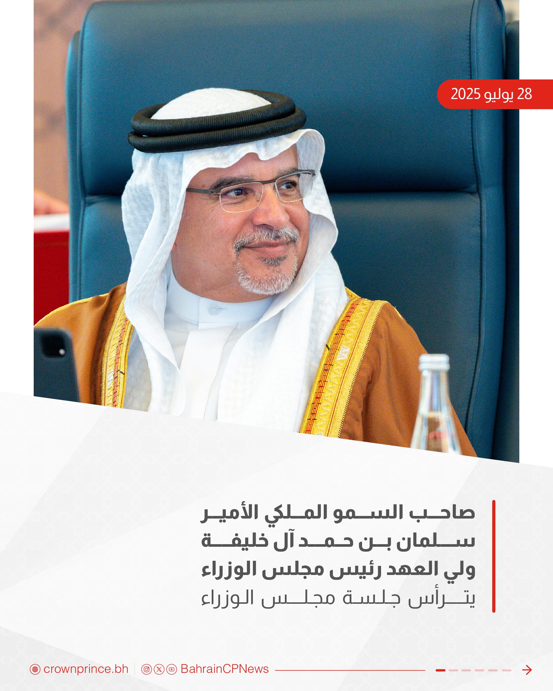 ترأس صاحب السمو الملكي الأمير سلمان بن حمد آل خليفة ولي العهد رئيس مجلس الوزراء حفظه الله، الاجتماع الاعتيادي الأسبوعي لمجلس الوزراء الذي عقد اليوم، بقصر القضيبية.