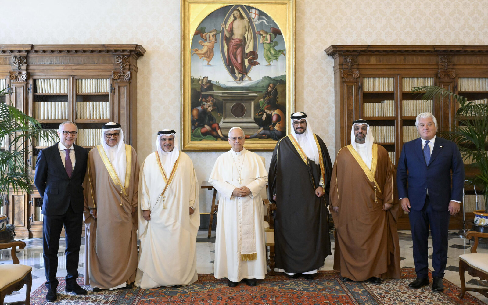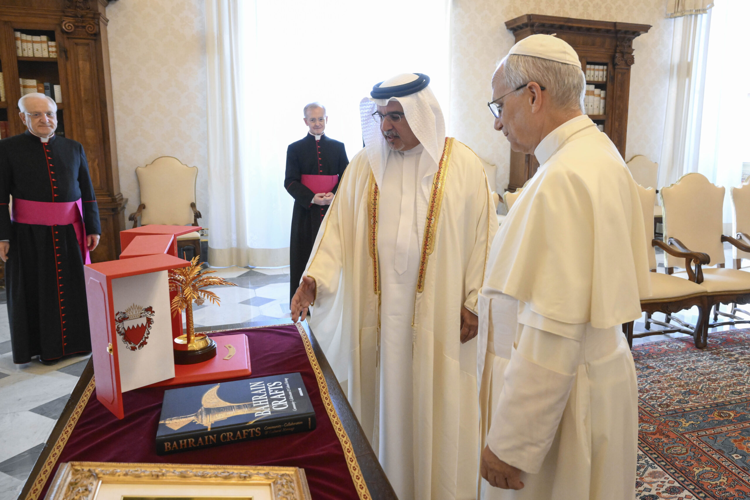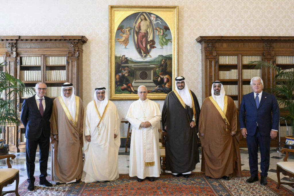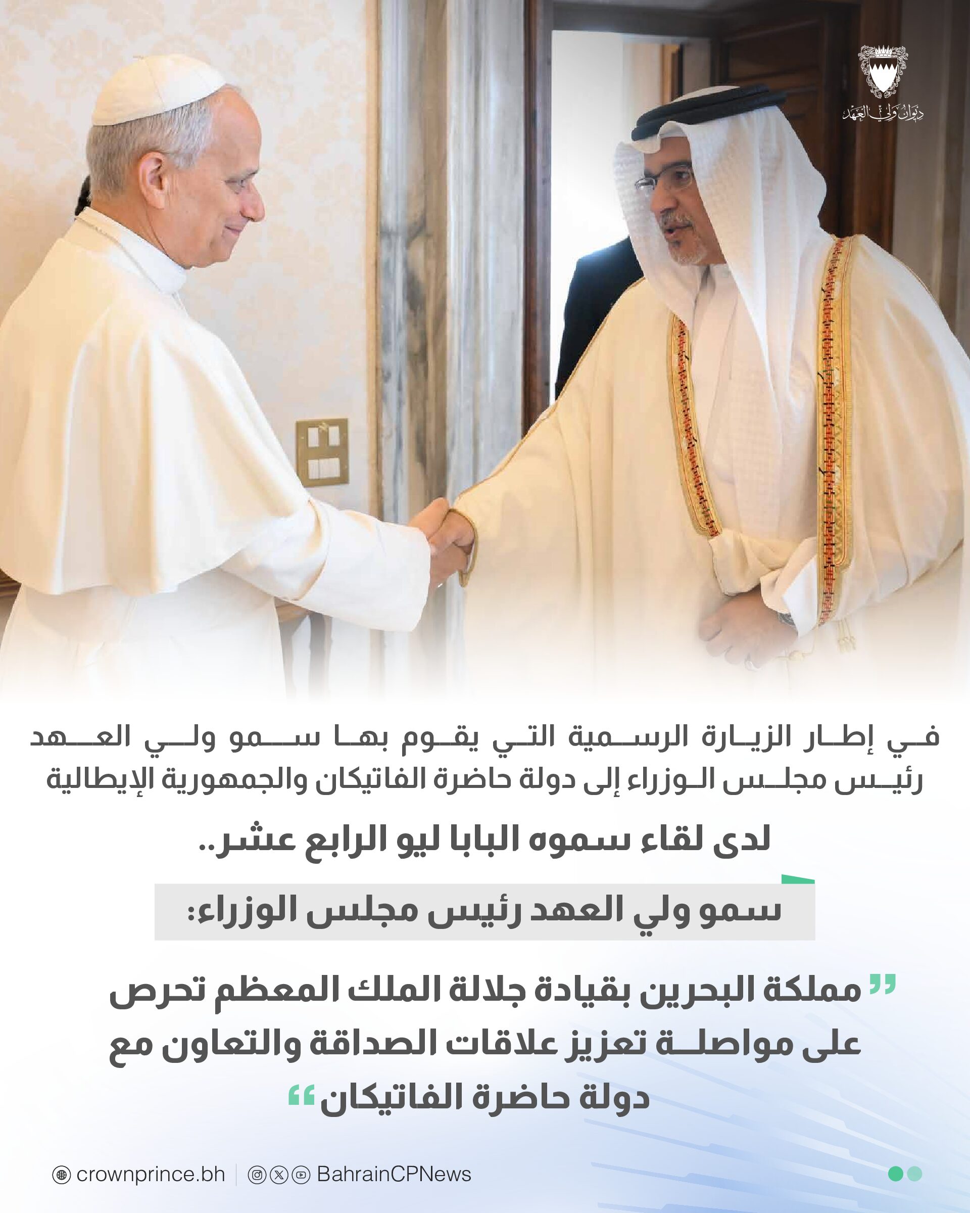 جاء ذلك لدى لقاء سموه حفظه الله اليوم، قداسة البابا ليو الرابع عشر بابا الفاتيكان، بحضور سمو الشيخ عيسى بن سلمان بن حمد آل خليفة وزير ديوان رئيس مجلس الوزراء، وسعادة الدكتور عبداللطيف بن راشد الزياني وزير الخارجية، ومعالي الشيخ سلمان بن خليفة آل خليفة وزير المالية والاقتصاد الوطني، وعدد من كبار المسؤولين، وذلك في إطار الزيارة الرسمية التي يقوم بها سموه إلى دولة حاضرة الفاتيكان والجمهورية الإيطالية، حيث نقل صاحب السمو الملكي ولي العهد رئيس مجلس الوزراء تحيات حضرة صاحب الجلالة ملك البلاد المعظم حفظه الله ورعاه إلى قداسة البابا ليو الرابع عشر، وتمنياته للفاتيكان بدوام الازدهار، فيما حمله قداسة البابا ليو الرابع عشر تحياته إلى حضرة صاحب الجلالة ملك البلاد المعظم حفظه الله ورعاه، وتمنياته لمملكة البحرين بمزيدٍ من التقدم والازدهار.