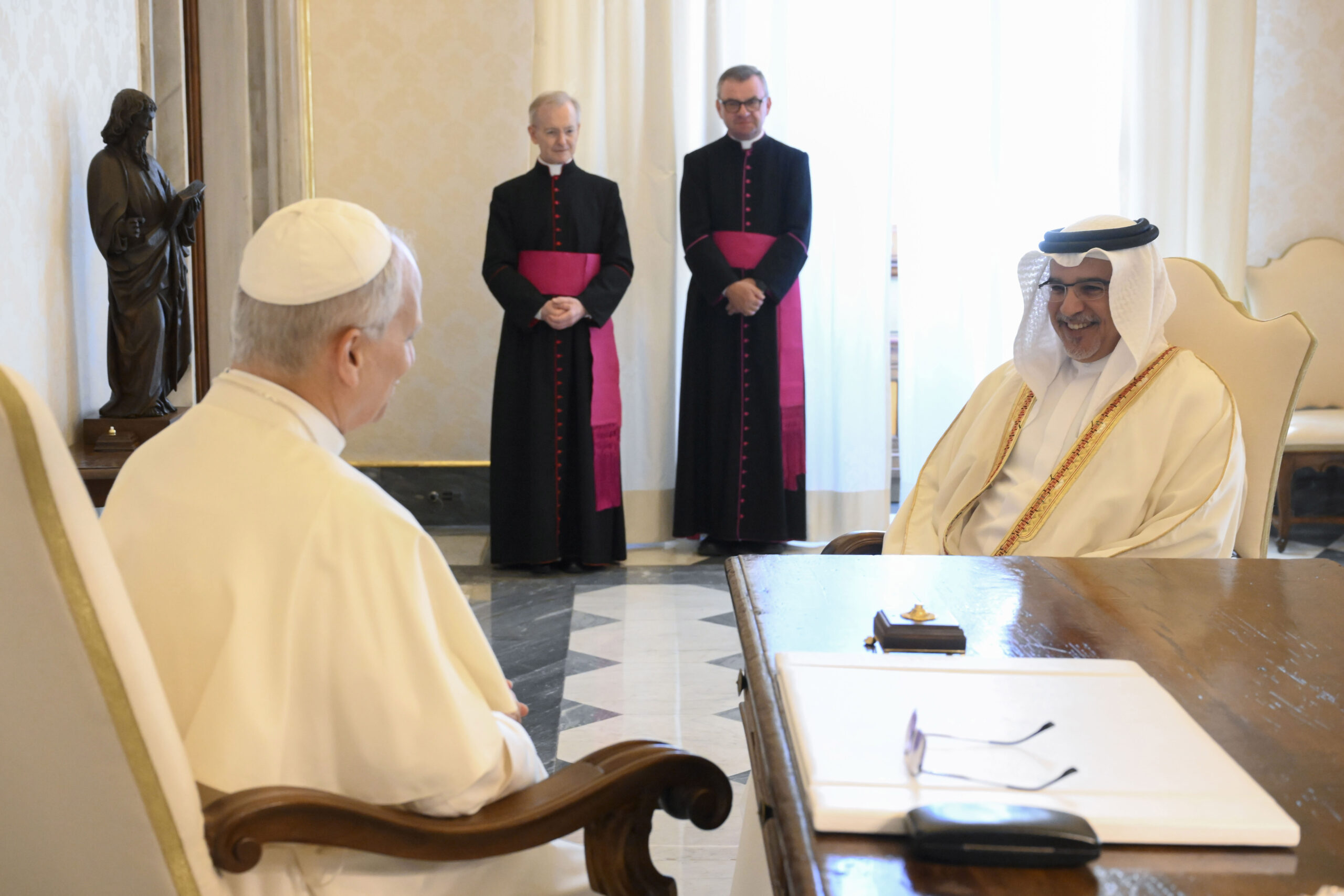 ولفت سموه إلى الدور البارز الذي تقوم به دولة حاضرة الفاتيكان في نشر التعايش ودعم الحوار والتفاهم، مؤكدًا سموه أن هذه الجهود تسهم في تعزيز قيم الأخوة الإنسانية التي تلتقي حولها مختلف الأديان والحضارات. معرباً سموه عن تقديره لما يبذله قداسة البابا من جهود مخلصة في دعم مسارات التعايش والتعددية ونشر قيم التسامح والمحبة والسلام، متمنيًا لقداسته دوام الصحة والسعادة والتوفيق في مساعيه الخيّرة والإنسانية.
