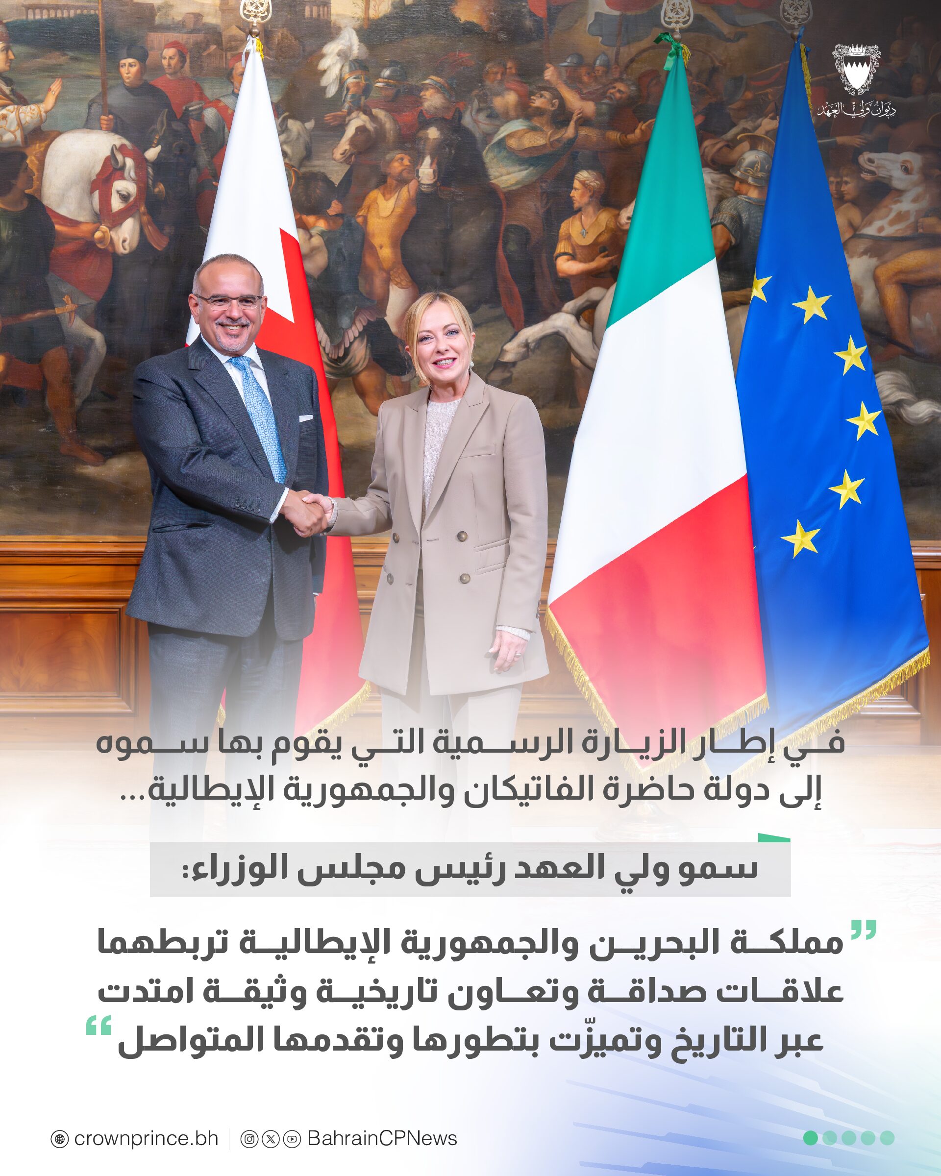 جاء ذلك لدى لقاء صاحب السمو الملكي ولي العهد رئيس مجلس الوزراء حفظه الله، بحضور سمو الشيخ عيسى بن سلمان بن حمد آل خليفة وزير ديوان رئيس مجلس الوزراء، وسعادة الدكتور عبداللطيف بن راشد الزياني وزير الخارجية، ومعالي الشيخ سلمان بن خليفة آل خليفة وزير المالية والاقتصاد الوطني، وعدد من كبار المسؤولين، دولة السيدة جورجيا ميلوني رئيسة وزراء الجمهورية الإيطالية الصديقة، وذلك في إطار الزيارة الرسمية التي يقوم بها سموه إلى دولة حاضرة الفاتيكان، والجمهورية الإيطالية، حيث أكد سموه الاعتزاز بما وصلت إليه العلاقات البحرينية الإيطالية من مستويات متقدمة في ظل ما يجمع البلدين الصديقين من اتفاقيات مشتركة، مشيراً سموه إلى أهمية مواصلة البناء على ما تحقق وتعزيز الشراكة الاستراتيجية بين البلدين الصديقين على كافة الأصعدة بما يسهم في خلق مزيد من الفرص الواعدة لتحقيق التطلعات والأهداف المشتركة.