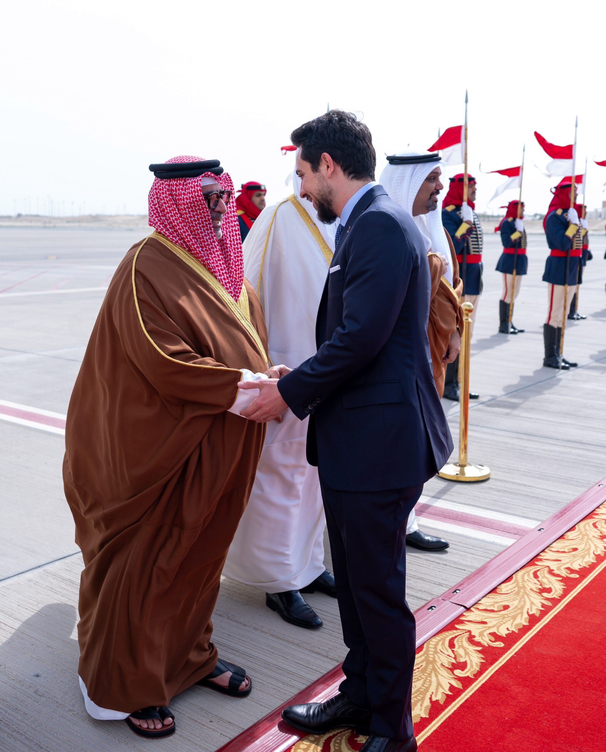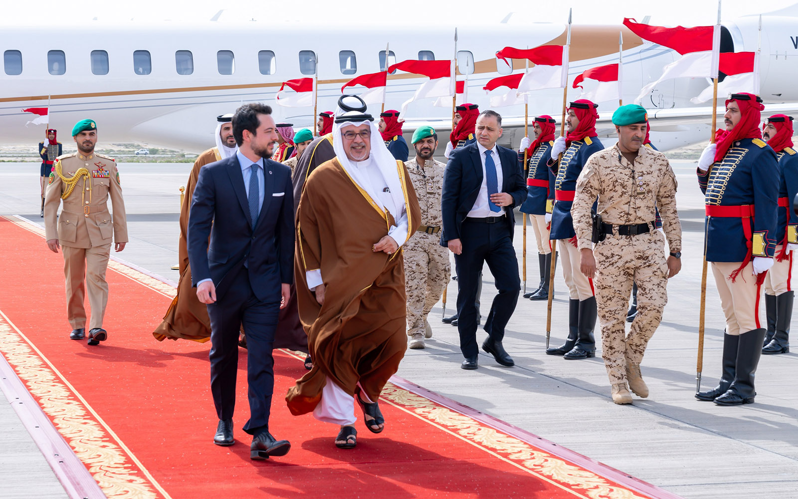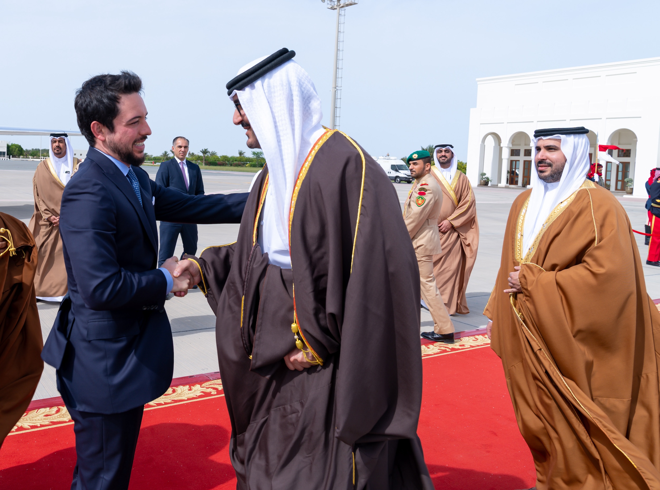 سمو ولي العهد رئيس مجلس الوزراء في مقدمة مستقبلي ولي عهد المملكة الأردنية الهاشمية لدى وصوله إلى مملكة البحرين