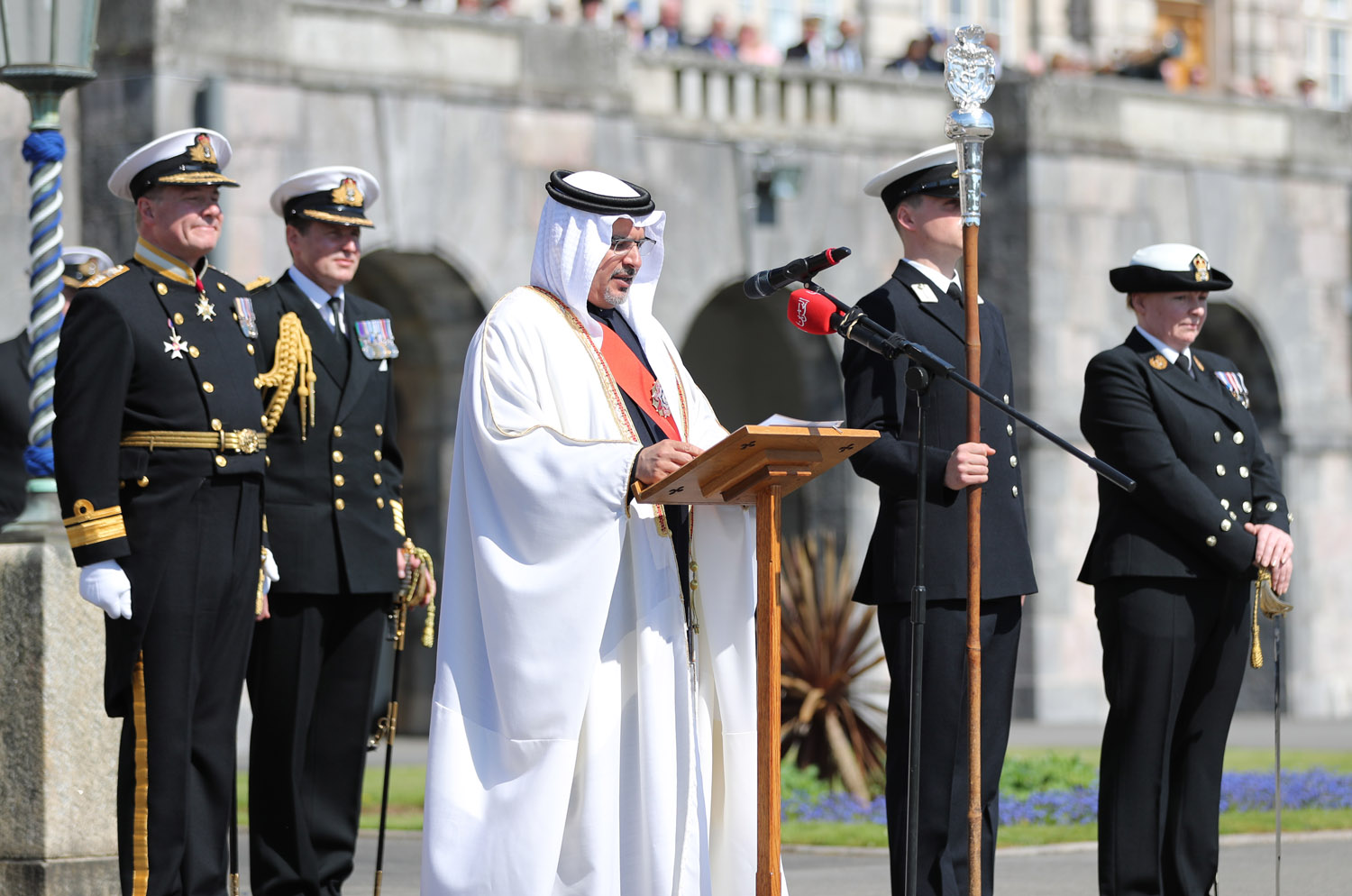 نحن في مملكة البحرين لدينا علاقات مع البحرية الملكية تتجاوز المائتي عام ونحن نعتز بما وصلت إليه من مستوى متقدم اكتسب فصلاً جديداً مؤخراً مع افتتاح منشأة الإسناد البحري البريطاني، وهي الأولى التي تفتتحها البحرية الملكية خارج المياه الإقليمية منذ خمسين عاماً.