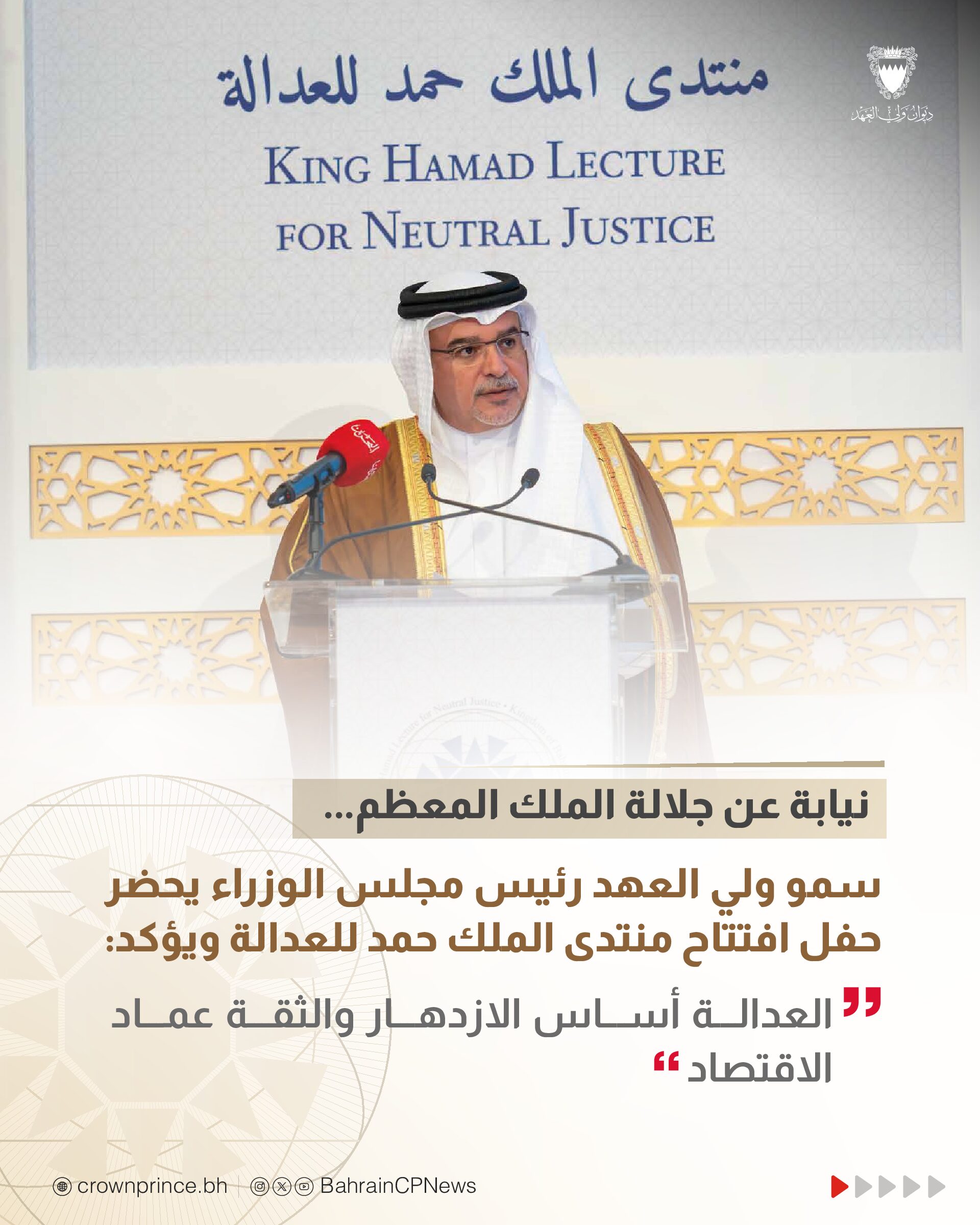 نيابةً عن جلالة الملك المعظم.. سمو ولي العهد رئيس مجلس الوزراء يحضر حفل افتتاح منتدى الملك حمد للعدالة ويؤكد: العدالة أساس الازدهار والثقة عماد الاقتصاد